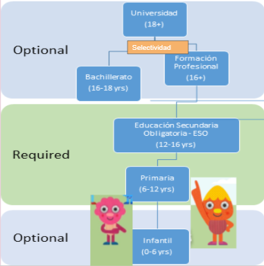 - Formación Profesional (optional): Vocational school; open to any student who has completed ESO, whether or not they’ve also done bachillerato and/or Universidad