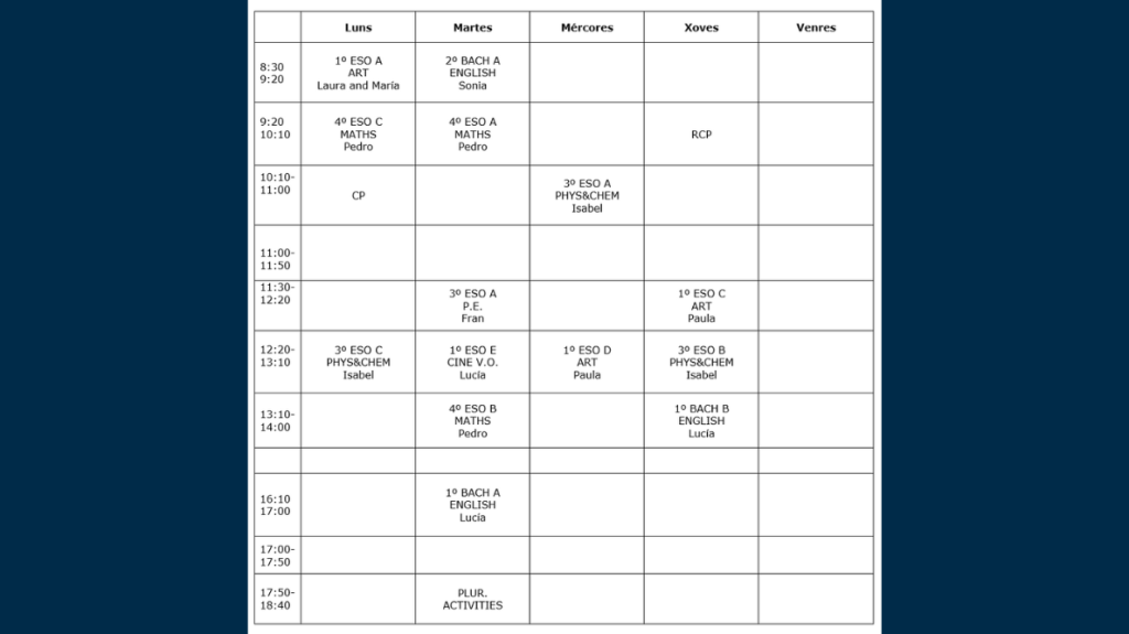 Within the public school system students have the option to enroll in bilingual programs starting from 1० (1st) of ESO. These programs are usually integrated into the school system and will entail students taking part of their courseload in English, and the other part in Spanish. While working with the bilingual department of your school you may work in English classes exclusively or in other subjects being taught in English. Additionally some TAs will work in English classes for non-bilingual sections and the role is similar between the two with alterations made to the English level.